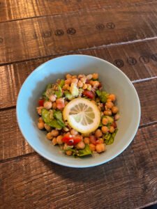 (chickpea, bulgur, red onion, lettuce, tomato, avocado, olive oil, lemon juice)