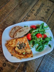 (Blat: migdale, fulgi de ovăz, susan; umplutură: ceapă, usturoi, praz, caju, tofu, pătrunjel, ulei de măsline)