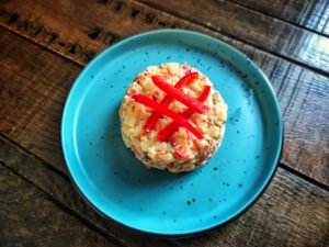(cartof, morcov, țelină, gogoșari în oțet, castravețiîn oțet, muștar, maioneză vegană) – servită cu pâine