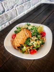(salată mix, morcov, roșii cherii, semințe de susan, crutoane din lipie, ceapă verde, șnitel Naturli, zeamă de lămaie, coriandru, miere, ulei floarea soarelui, ulei măsline, ulei susan, sos de soia, sweet chilli, sos mirin)
