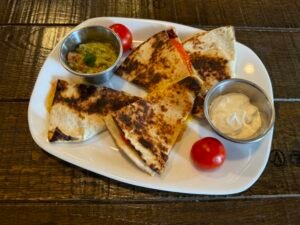 Tortilla wrap, cheese mix, bell pepper, red beans, corn/sourcream/ guacamole
