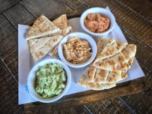 Humus – 120 g/ Pastă de roșii uscate și fasole albă – 120 g/ Cremă de brânză cu busuioc și chives – 120 g/ Pită – 170 g