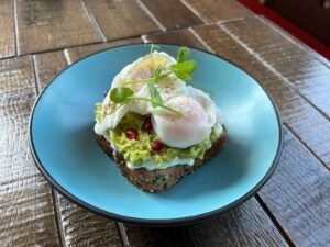Avocado, pâine toast, brânză cottage, ouă poșate, rodie, suc lămâie.