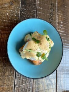 Somon afumat, pâine toast, ouă poșate, sos olandez.